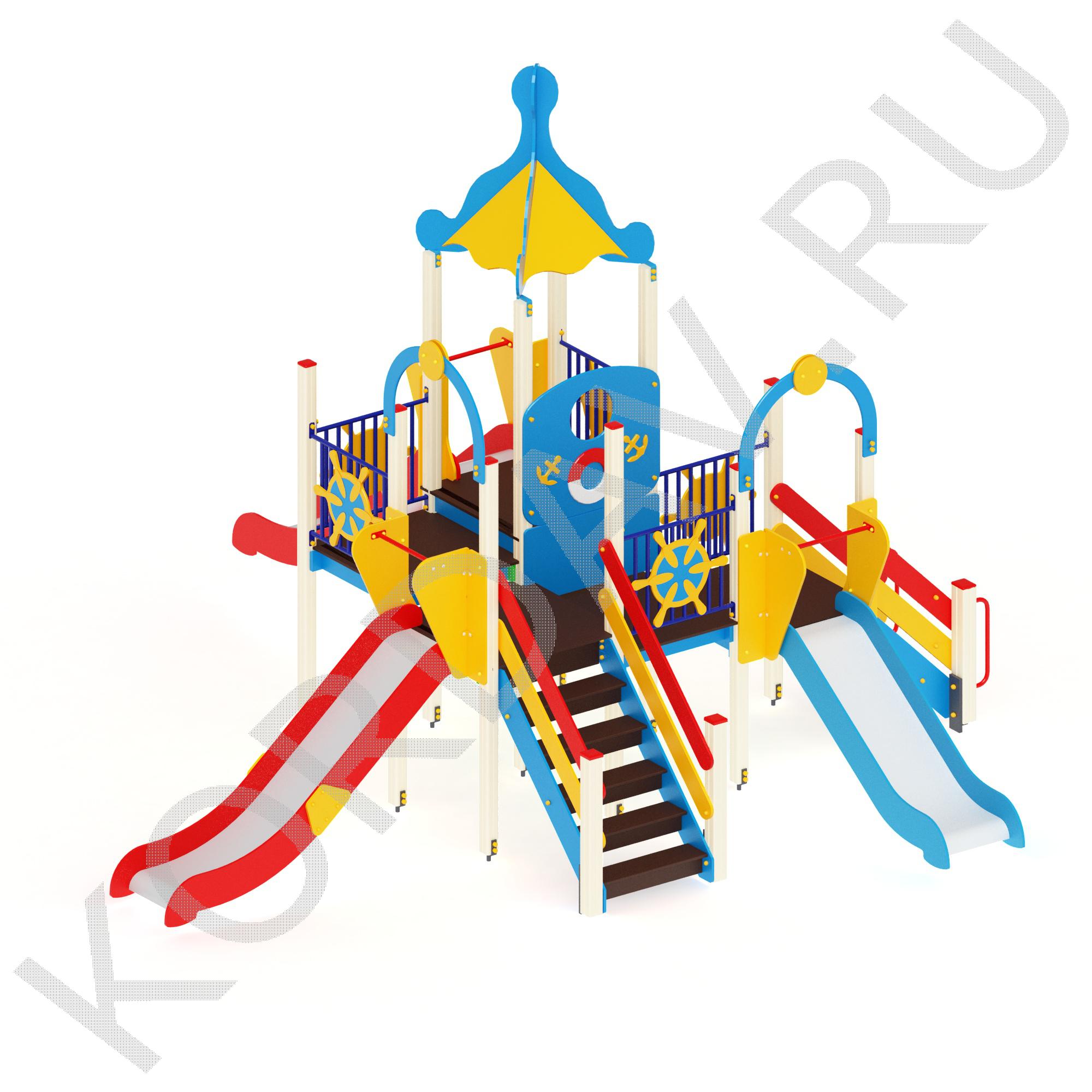 Игровая площадка выполнена в морской тематике украшена разными декоративными элементами: якорями, спасательными кругами, капитанскими штурвалами. Конструкция состоит из высокой башни с четырехскатной крышей; трех скат-горок высотой 900, 1200 и 1500 мм; лестницы высотой 1200 мм и 900 мм; ограждения на башне. Для изготовления площадки использованы: полотна нескользкой ламинированной фанеры 18 мм; лист влагостойкой фанеры 18,27,30 мм; брусья клееные 90х90 мм; нержавеющая сталь – цельный лист толщиной 1,5 мм и шириной 540 мм; профиль стальной 25х40 мм; круглая труба 32,27 мм; уголки металлические 40х40х4 мм. Для безопасности детей, на фанерных и стальных элементах нет острых кромок. Для покраски дерева и фанеры использован акриловый грунт и двухкомпонентная полиуретановая краска. Порошковое окрашивание использовано для покрытия металлических элементов.